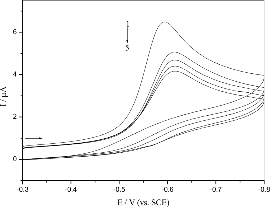 Figure 5 shows the repetitive differential pulse voltammogram of o-nitrophenol electrochemical reduction using a DNA-modified GCE. It could be found that its reduction behavior on a DNA-modified GCE was similar to what happened at the bare GCE (Figure 2), but the potential shifted to negative value and the peak current decreased about 12% compared to their first scan. It indicated that pre-concentration of hydroxylamine onto the DNA matrix, denoted by the increase of the reduction peak for the nitroso R2 and azoxy R3 derivative with successive scans. Thus the DNA gel on the electrode surface could accumulate the analyte on it [].