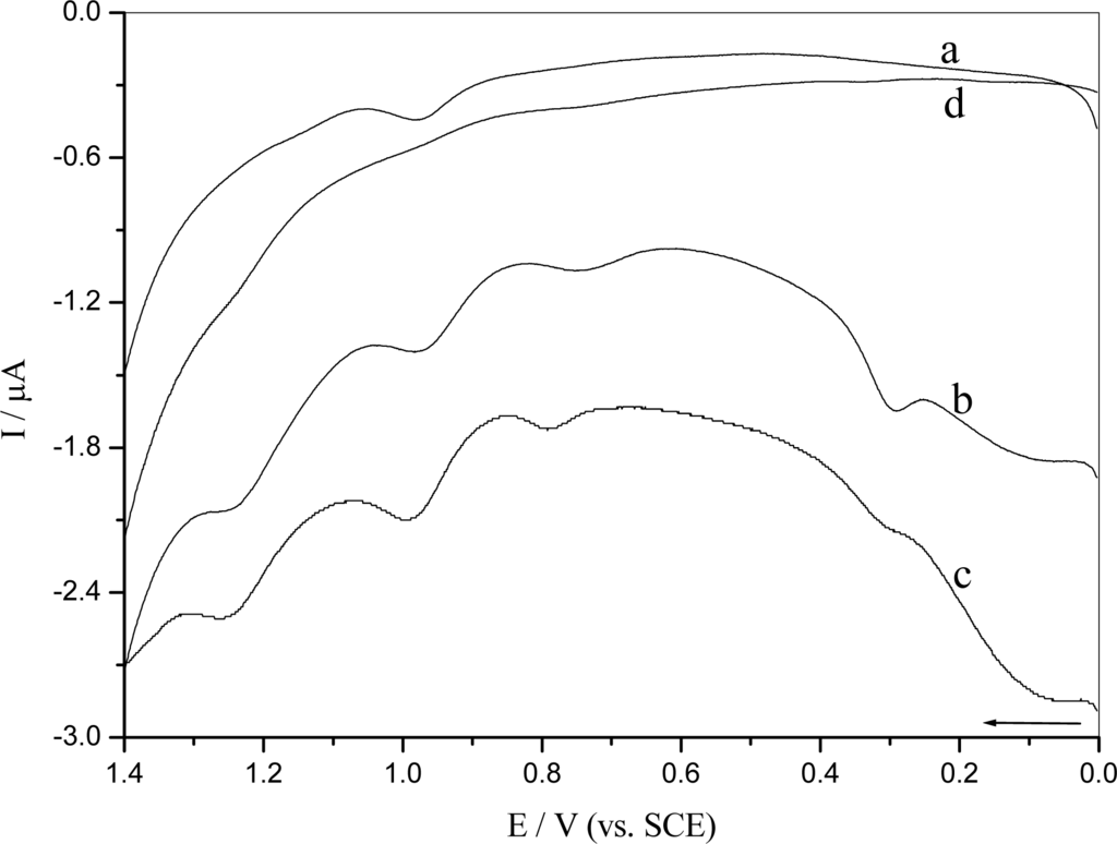 In order to investigate that electrochemical reduction of o-nitrophenol generates short-lived radical that interacts with DNA causing damage, differential pulse voltammetry was applied to detect DNA damage using a DNA-modified GCE. The blank experiment, i.e. oxidation at DNA-modified GCE without o-nitrophenol (Figure 6d), was performed in buffer solution to test the above hypothesis. There were almost no oxidation peaks of the DNA base, because nucleobases within native DNA are hidden inside the helix and stiffness of the structure keeps them far from the electrode surface []. Figure 6a shows the differential pulse voltammetry of o-nitrophenol oxidation using DNA-modified GCE. There was only an oxidation peak at + 0.982 V, which corresponded to the o-nitrophenol oxidation (Figure 6 curve a). However, the damage to DNA was detected if o-nitrophenol was reduced at a constant deposition potential Ed = − 0.60 V for 2 min (Figure 6, curve c). The appearance of two oxidative peak was attributed to guanine, Epa = + 0.785 V and adenosine, Epa = + 1.271 V []. In addition, the peak current at Epa = + 0.982 V increased. It was interesting to observe DNA damage if the reduction of o-nitrophenol was performed in repetitive differential pulse scanning from 0 to − 0.80 V (10 scans) (Figure 6, curve b). This distinctly indicated that o-nitrophenol could damage to DNA after the o-nitro-phenol underwent reduction process. The radicals generated in reduction process of the o-nitrophenol interacted with DNA [, ]. The appearance of purine oxidation peak demonstrated clearly that the radicals caused distortion of DNA double helix and exposure of the bases.