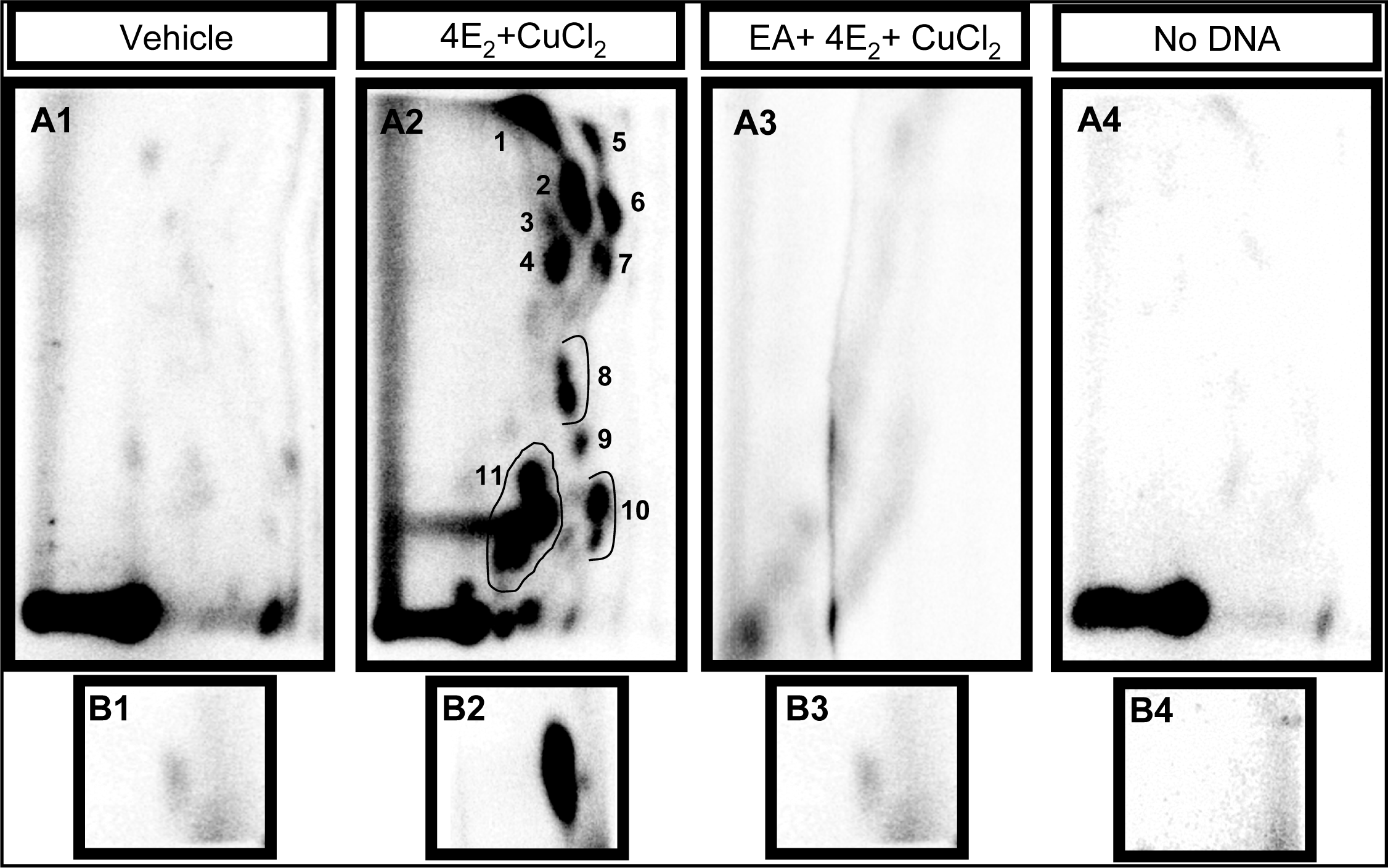 Representative 32P-labeled DNA adduct maps of both uncharacterized oxidative adducts (A1-A3) and 8-oxodG (B1–B3) generated by redox cycling of 4E2 and CuCl2 in vitro. The unidentified adducts (5 μg DNA) and 8-oxodG (0.5 μg) were 32P-labeled and separated using two directional PEI-cellulose TLC. D1 (bottom to top) and D2 (left to right) solvents were as described in Materials and Methods.
