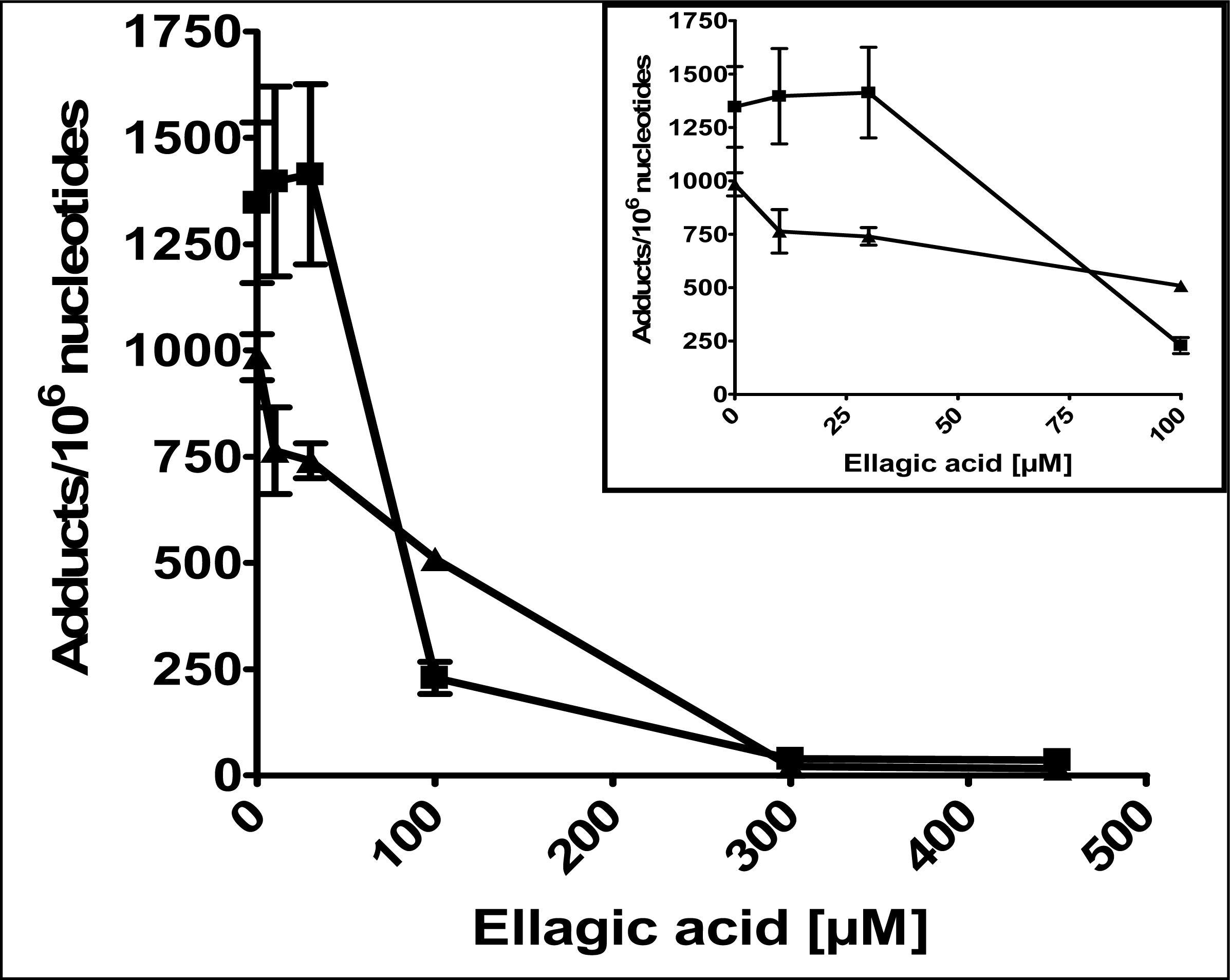 Effect of increasing concentrations of ellagic acid on oxidative DNA damage. Both unidentified oxidative adducts (triangles) and 8-oxodG (squares) were measured using 32P-postlabeling/TLC and are represented as mean ± SE of 4 replicates. The inset shows the effects at lower concentrations. The test for linear trend (Scheffe’s t-test) was statistically significant with a p-value <0.0001.
