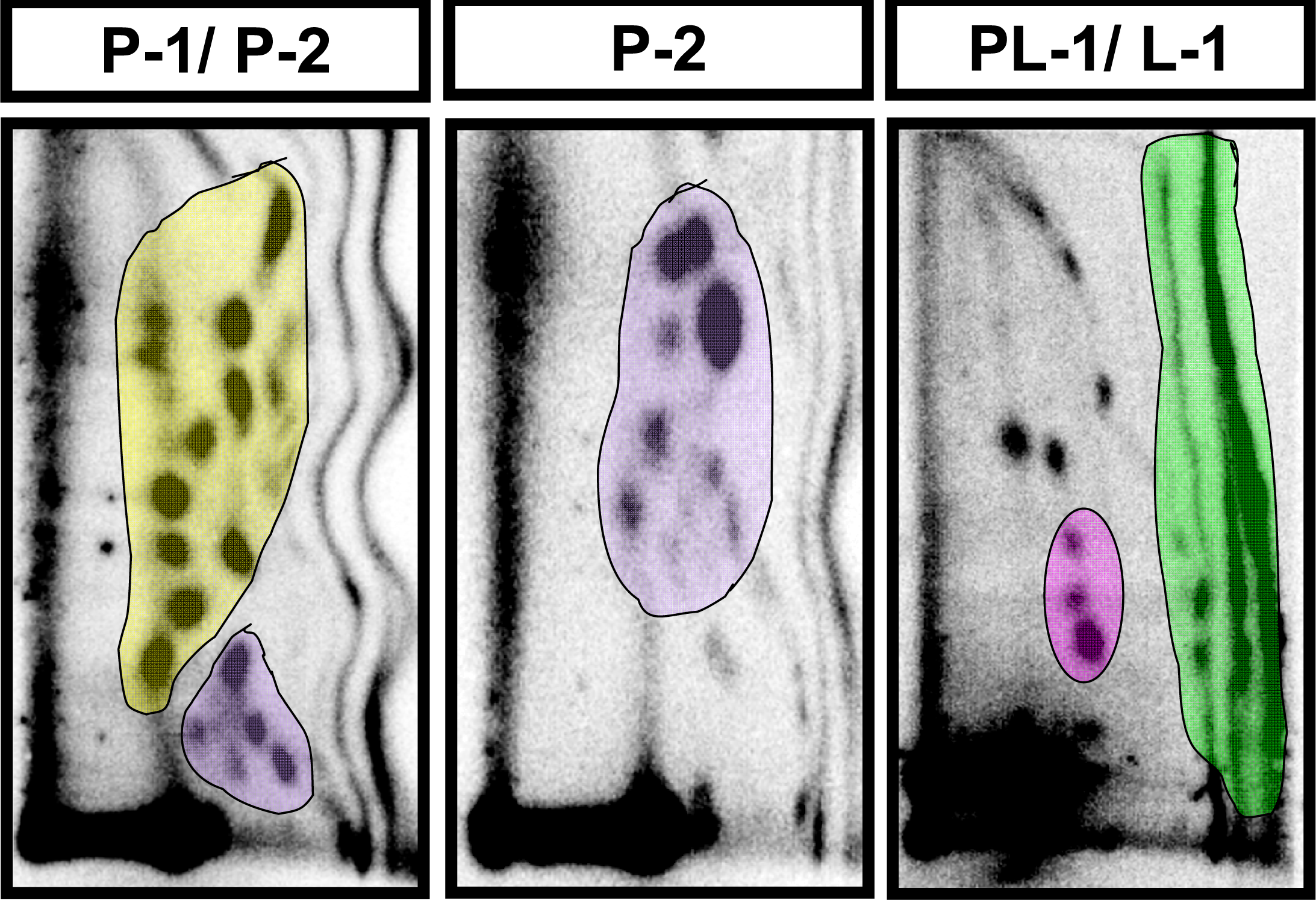 Representative maps of 32P-labeled endogenous DNA adducts from liver of CD-1 mice. Mice were fed either a control diet or diet supplemented with strawberry, blueberry or red raspberry (5% w/w each). Labeled adducts were separated by 2-D PEI-cellulose TLC as described in Materials and Methods. Adducts were classified into different subgroups (P-1- yellow; P-2- purple; PL-1- pink; L-1- green) based on their polarities, which was in the following descending order, P-1 >P-2 > PL-1 > L1 as described [13]