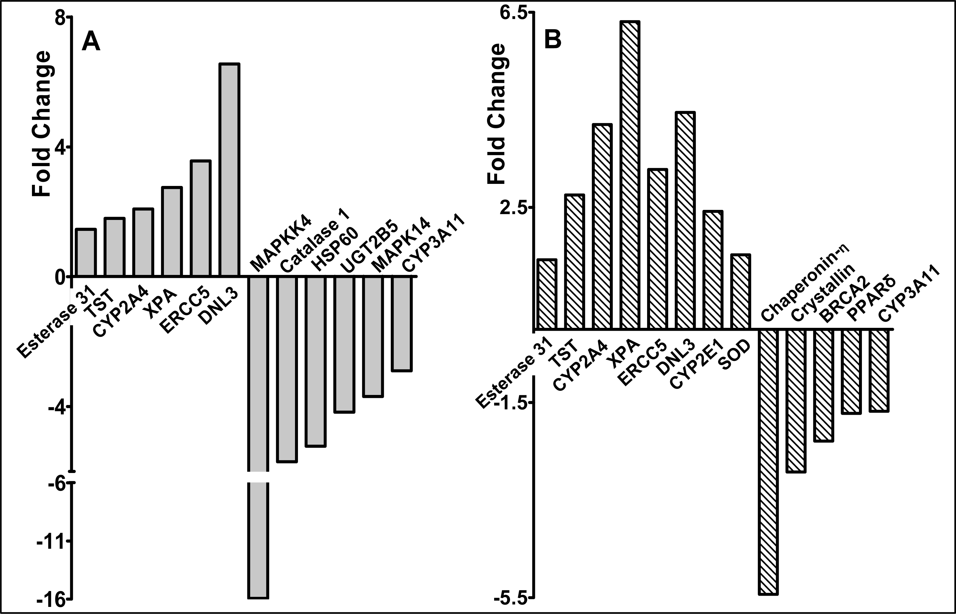 Hepatic genes with significantly altered expression in female CD-1 mice fed diets supplemented with either 5% (w/w) raspberry (A) or 400 ppm ellagic acid (B) compared to the control diet. Complimentary DNA synthesized from mRNA was hybridized to Atlas™ Mouse stress array as described in Materials and Methods. TST-Thiosulphate sulphur transferase; XPA- Xeroderma Pigmentosum group A complementing protein; ERCC5 - Excision repair cross complementation group 5; DNL3 - DNA Ligase III; SOD –Superoxide Dismutase, extracellular; MAPK- Mitogen activated protein kinase; MAPKK-MAP Kinase kinase.