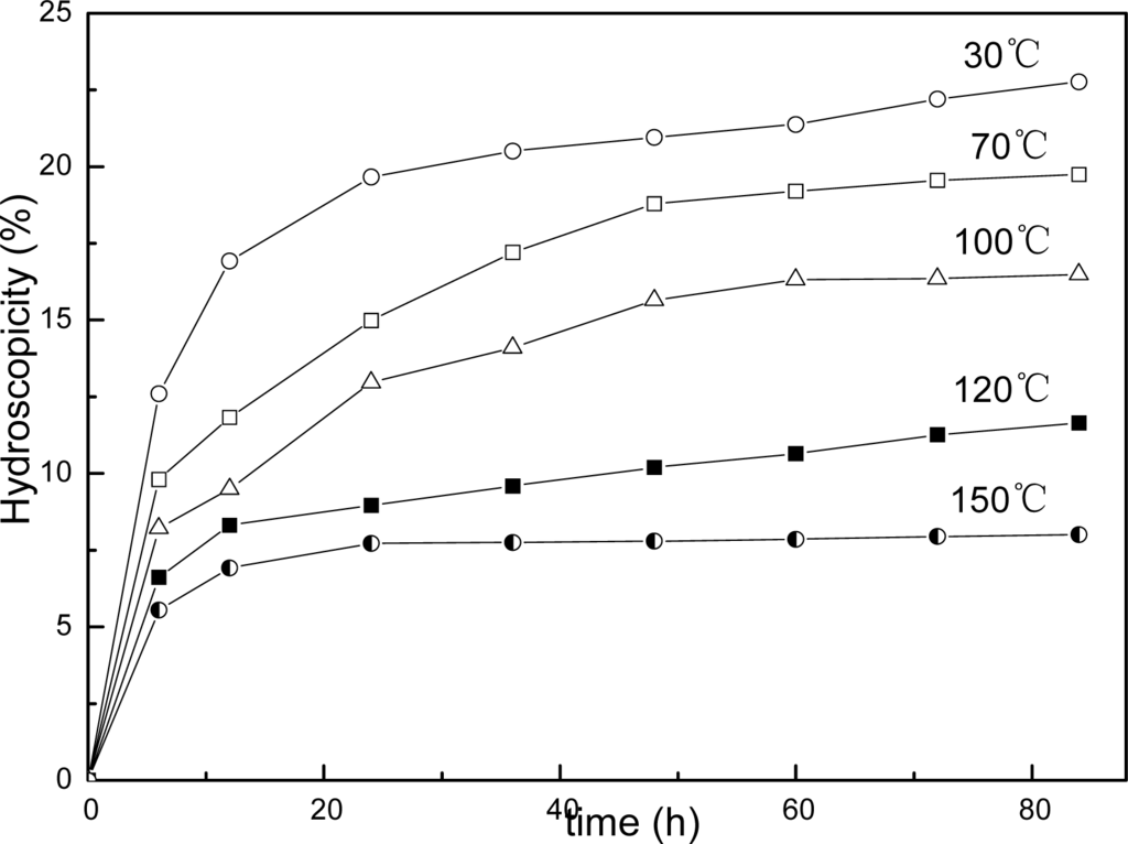 This structure difference can also be reflected in copolymer’s hydroscopicity property as showing in Figure 8, 9 and 10. It is clear that the samples’ hydroscopicities decrease following increasing the thermal treatment temperature, however, the hydroscopicities for filmes of AUF and AMF blends present much lower values compared to the pure latex treated at the same temperature. The result still reveals a factor related to macromolecular network structure in polymer films. In general, the film formation process of polymer latex can be described in three stages [23]. First, water evaporates first from the surface of the latex, then the spherical particles move closer to each other and are deformed into hexagons, the interfacial tension between polymer and water/air causes gradual coalescence, at last, the observable boundaries among particles are deformed and disappear, the polymer chains of the particle surface interdiffuse each other, and a continuous film is finally formed. For AUF and AMF blends, certain amounts of MF or UF resin may deposit toward the interface of particles with the evaporation of water during film formation. These resin molecules can act as crosslinkers to link the latex particles with chemical bonds under higher temperature. The process can produce higher crosslinking densities in polymer films. The mechanical properties of films increase, and the film’s hydroscopicities decrease. Therefore, it is understandable that the reduction of hydroscopicities for films of AUF and AMF blends reflects actually the fact that their higher crosslinking densities and relative perfect network structures can effectively prevent water from penetrating into polymer’s matrix and enhance their water resistant property.