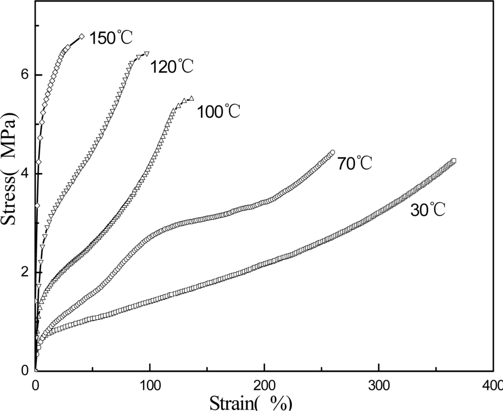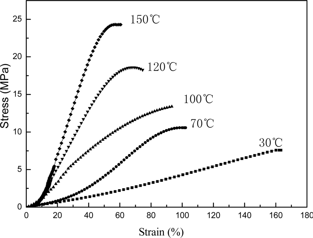 Figure 5, 6 and 7 present the mechanical properties for copolymer’s films cast from pure latex, AMF and AUF blends, respectively. It was found that the tensile strengths for films of pure latex and its blends increase following the increase in the thermal treatment temperature. However, their elongations at break decrease accordingly. On the other hand, the tensile strength for films of AMF and AUF present much higher values compared with the film of pure latex. The results may reveal that chemical reactions in the pure latex occured among the epoxy and hydroxyl groups, which results in formation of chemical crosslinking under the raising of the temperature. Furthermore, much more emical reactions in AMF and AUF blends may also be initiated among the epoxy and hydroxyl groups, and also, the amine and hydroxyl groups between latex particles and waterborne resins. As a result, it leads to a significant increase in the corsslinking densities of AMF and AUF films, and at the same time, enhances their crosslinking networkes.