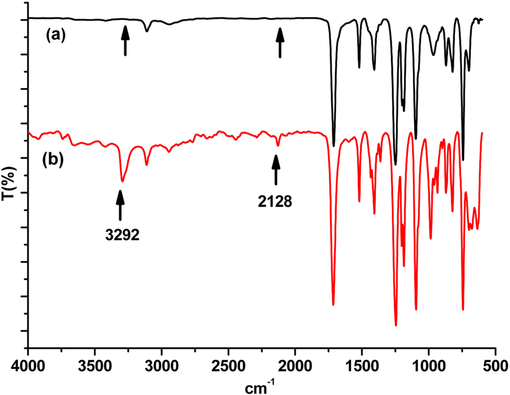 The FT-IR spectrum shown in Figure 2 (b) also establishes the structure of the monomer. Accordingly, diagnostic stretching vibrations of ester carbonyl, aromatic C-H and terminal acetylenic C-H and C ≡ C bands appear at 1716 cm−1, 3112 cm−1, 3292 cm−1 and 2128 cm−1, respectively. Moreover, sp2 C-O and sp C-O stretching vibrations observed at 1246 and 1095 cm−1 are additional support for the ester structure.