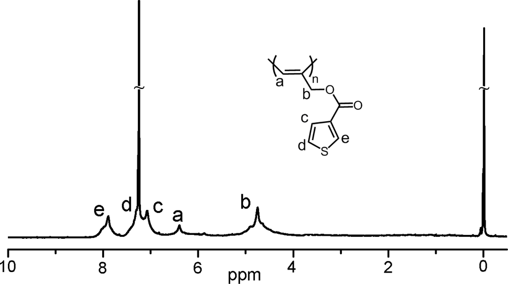 Further analysis of the polymer by 1H-NMR as presented in Figure 3 indicated the characteristic peak for cisoid =C-H proton at 6.4 ppm. Additionally, the two protons, neighboring ester group and double bond emerge at 4.75 ppm with a slight shift compared to C3 protons of the precursor propargyl unit (see Figure 1). This shift clearly suggests the transformation of triple bond to double bond. The retention of aromatic peaks was also noted.