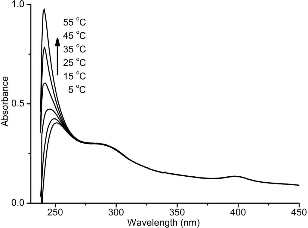 UV-vis spectral changes of PAT-2 from 5 to 55 °C measured in CHCl3 [PAT-2]= 1.8 × 10−5.