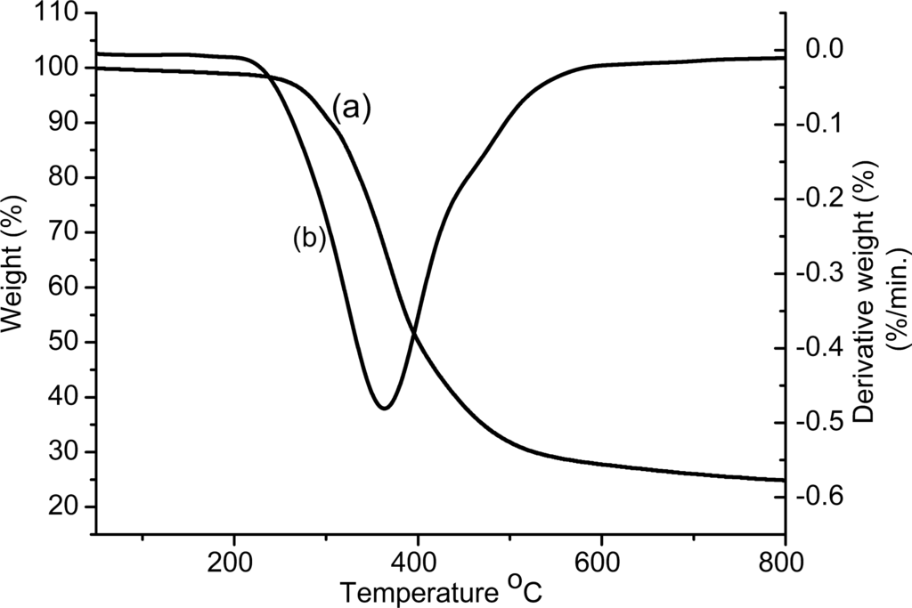 TGA thermogram of PAT-2 (a) recorded under nitrogen at a heating rate of 10 °C/min., (b) derivative of curve (a).
