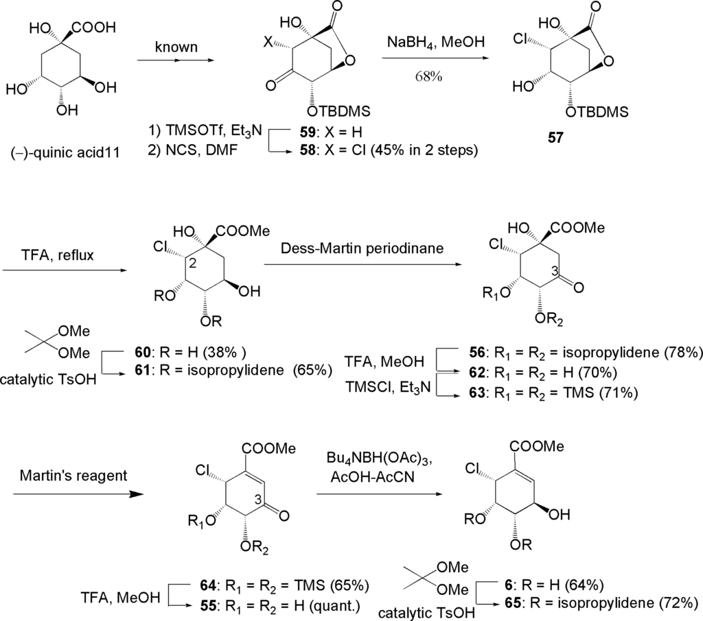 The synthesis of 6 was carried out as illustrated in Scheme 7. Lactone 59 derived from (−)-quinic acid 11 according to literature [, ] was chlorinated with NCS with excellent face selectivity to give α-chloroketone 58 via silylenolether in 45% yield in 2 steps. The following reduction of 58 with NaBH4 gave alcohol 57 as the sole product. The chemical yield of 57 was improved by sequential reactions from 45% in 2 steps to an overall yield of 57% in 3 steps from ketone 59. Treatment of 57 with TFA in MeOH under reflux afforded tetraol 60 in 38% yield. Then, 60 was converted into acetonide 61, which was oxidized with Dess-Martin periodinane to give hydroxyketone 56. The isopropylidene moiety of 56 was removed with TFA because 56 could not be dehydrated by any dehydrating agents. One plausible explanation was that 56, conformationally fixed by an isopropylidene bridge, could not be transformed into a suitable transition state for dehydration. Resultant triol 62 was converted into reactive hydroxyketone 63 that was in turn dehydrated to enone 64 with Martin’s sulfrane dehydrating agent (bis[α,α-bis(trifluoromethyl) benzyloxy] diphenyl sulfur) [] in 65% yield.