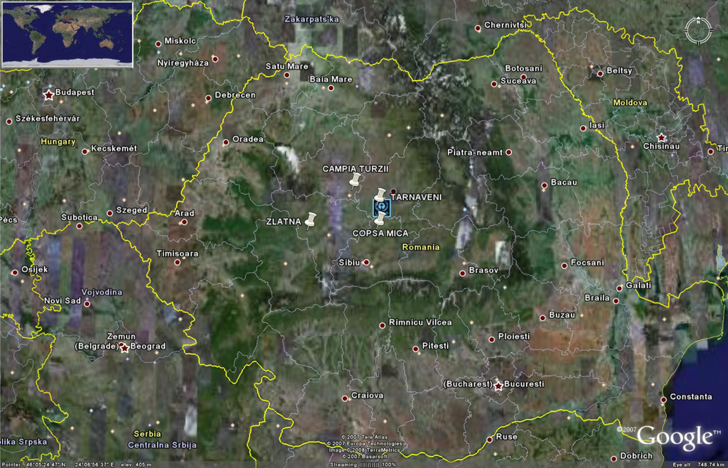 Four areas near to the Romanian towns known as important pollution centres (Târnăveni area - Mureş County, Copşa Mică - Sibiu County, Zlatna - Alba County, and Câmpia Turzii - Cluj County) were choose to be included into the study (Figure 1, from Google Earth1).