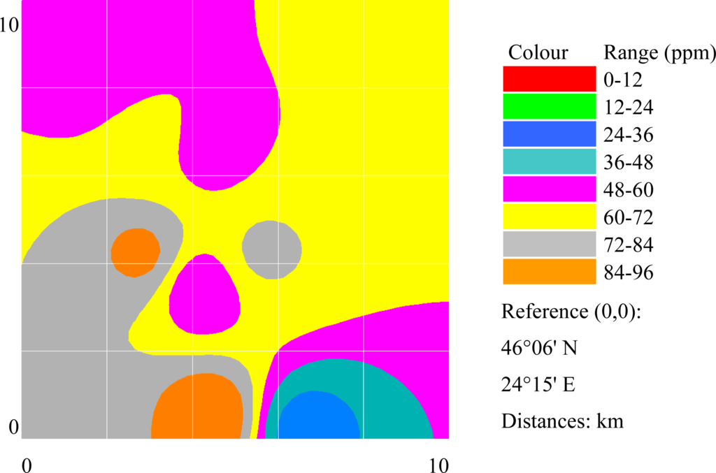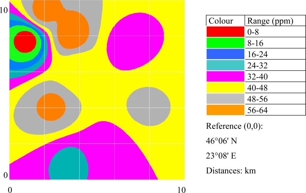 The lead concentrations revealed to exceed by 14 times the ALS. A spatial distribution of Pb in Copşa Mică area at 5 cm depth was obtained and it is presented in Figure 9.