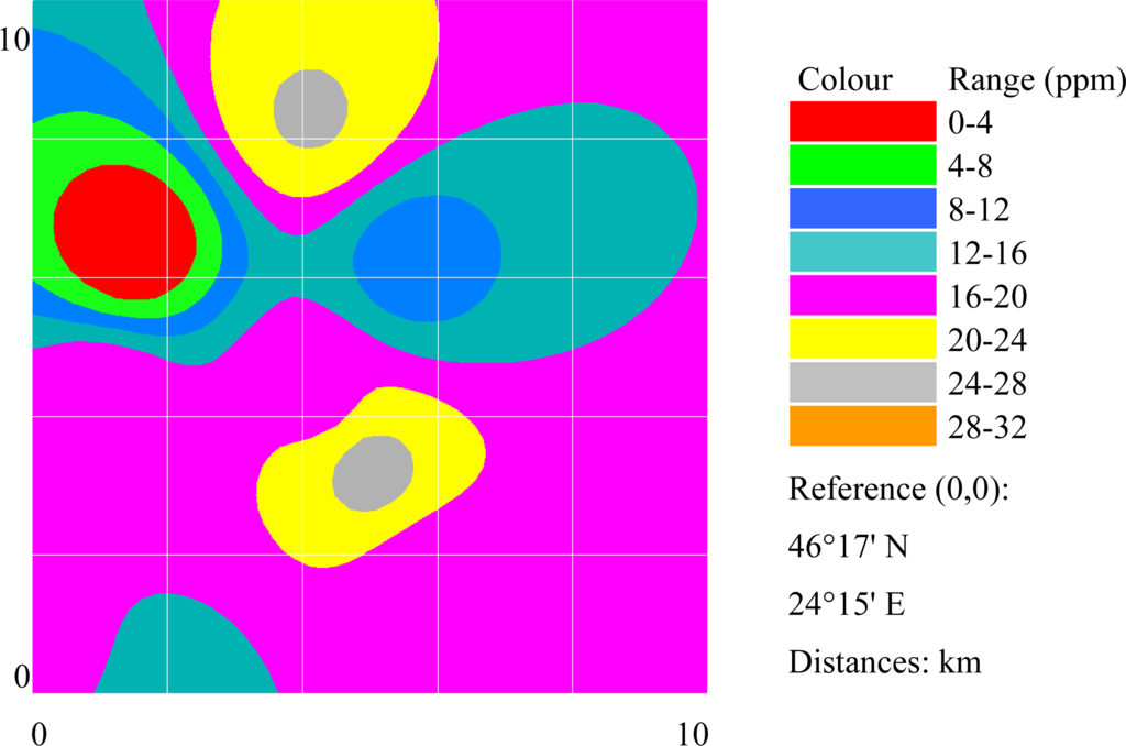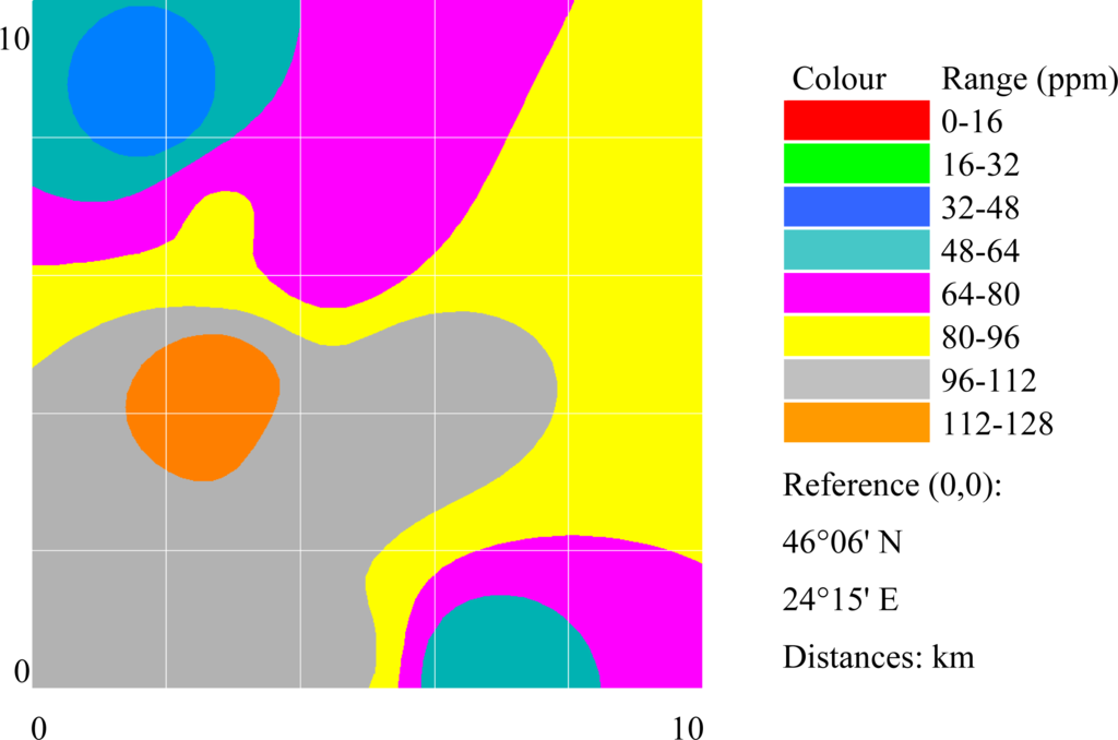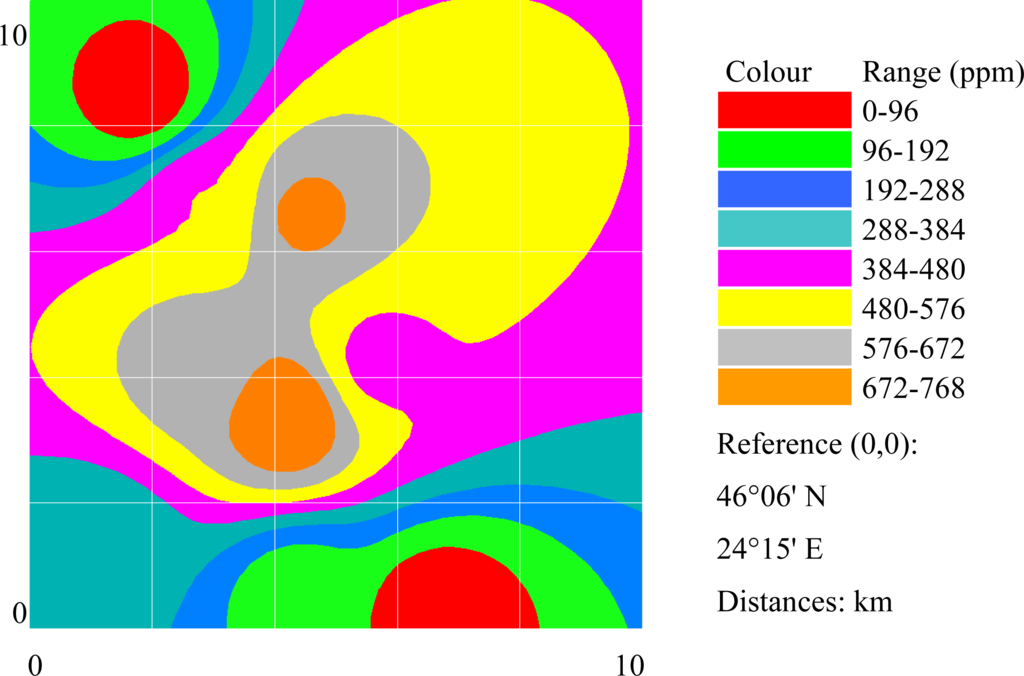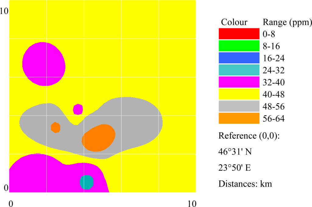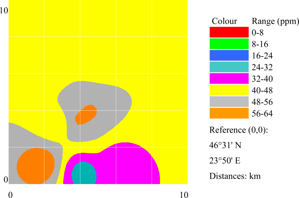 The choice of locations for measures is very important. The measurement of the concentration in air, in running waters or of the accumulations of chemical elements in lichens, provides data on the time of measurements or in a brief period of time [37]. Unlike the method of studying the accumulations in lichens [38], the method of direct study of element concentration in soil eliminates the necessity of a reference batch and the corrections are not necessary.
