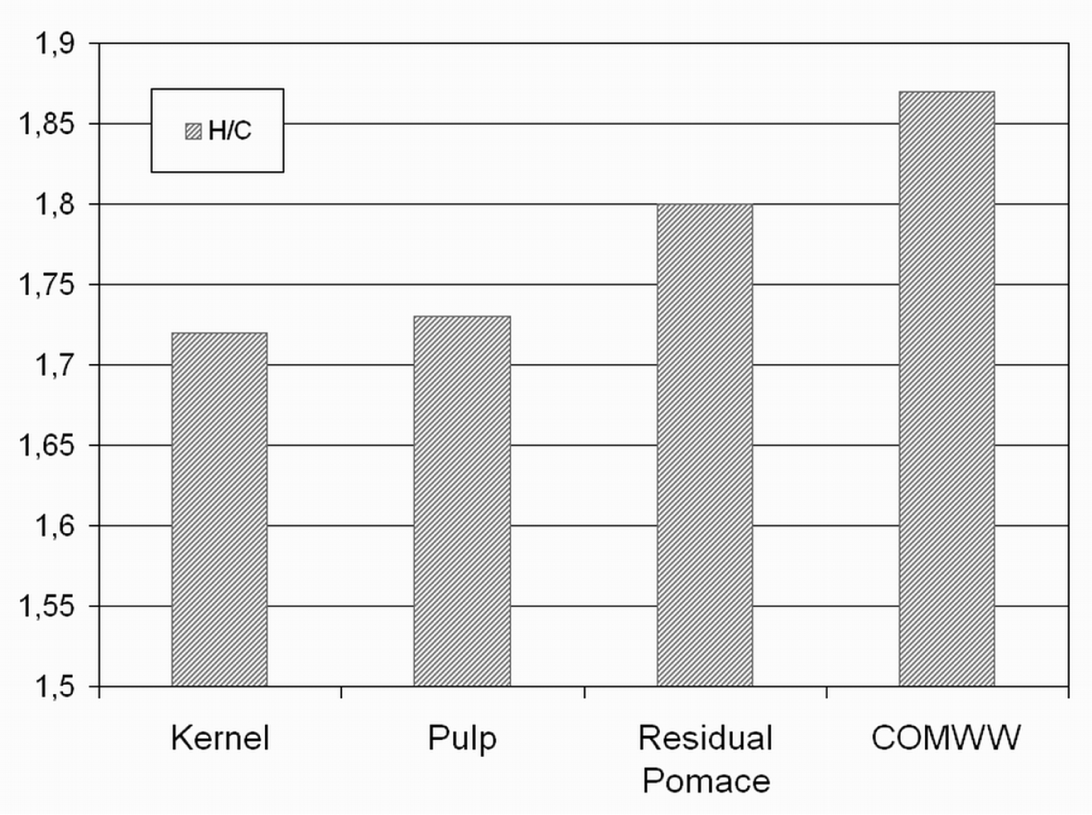 Hydrogen/Carbon ratio for the olive pit, pulp, residual olive cake and concentrated OMWW.