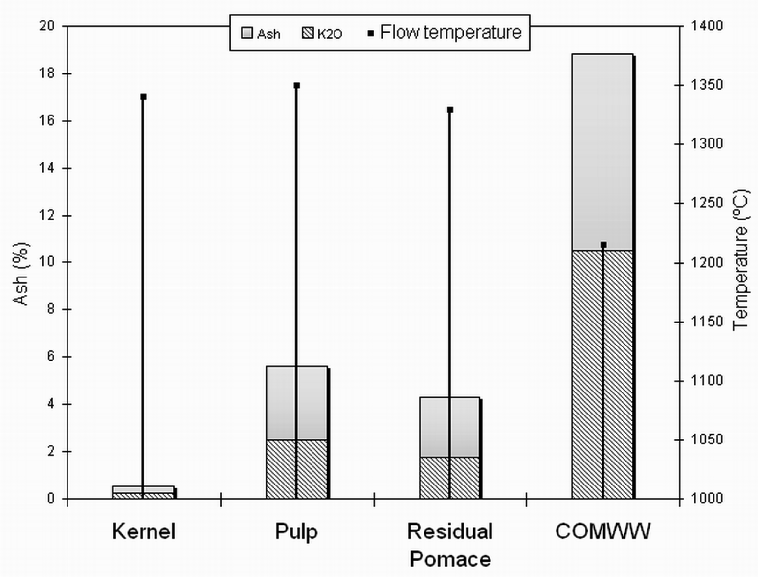 As far as the behaviour of the ashes is concerned, the COMWW is the most problematic fraction, since it presents higher amounts of ashes and lower melting point.