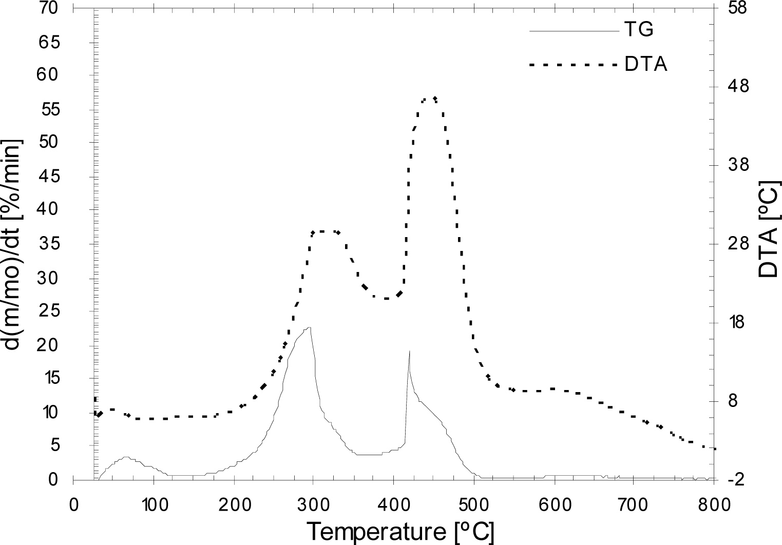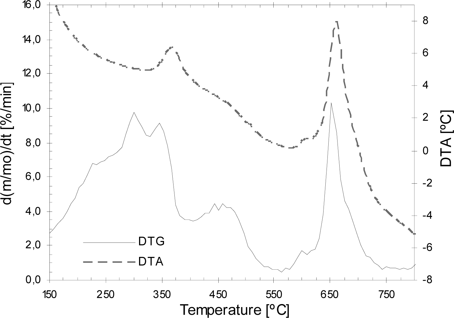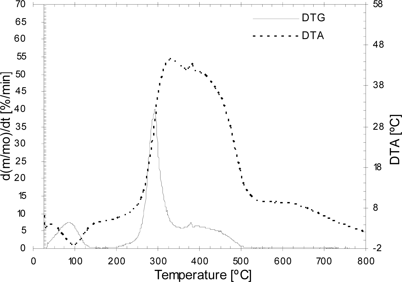 As can be observed, the mass loss begins when the temperature of the sample increases over 150ºC, due to the beginning of the liberation of some volatiles and their combustion. In the fast combustion region, a maximum of mass loss occurs. The mass loss velocity becomes lower immediately at temperatures close to 350ºC and increases slightly, again, between 400ºC and 500ºC. Alter that point, the burning ratio decreases and, after a short period it increases significantly, obtaining the maximum value of the burning velocity due to the oxidation of the char.