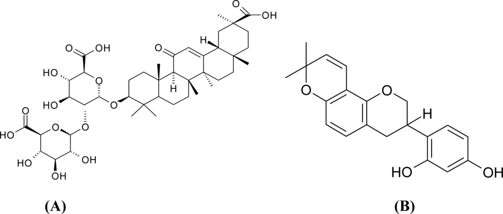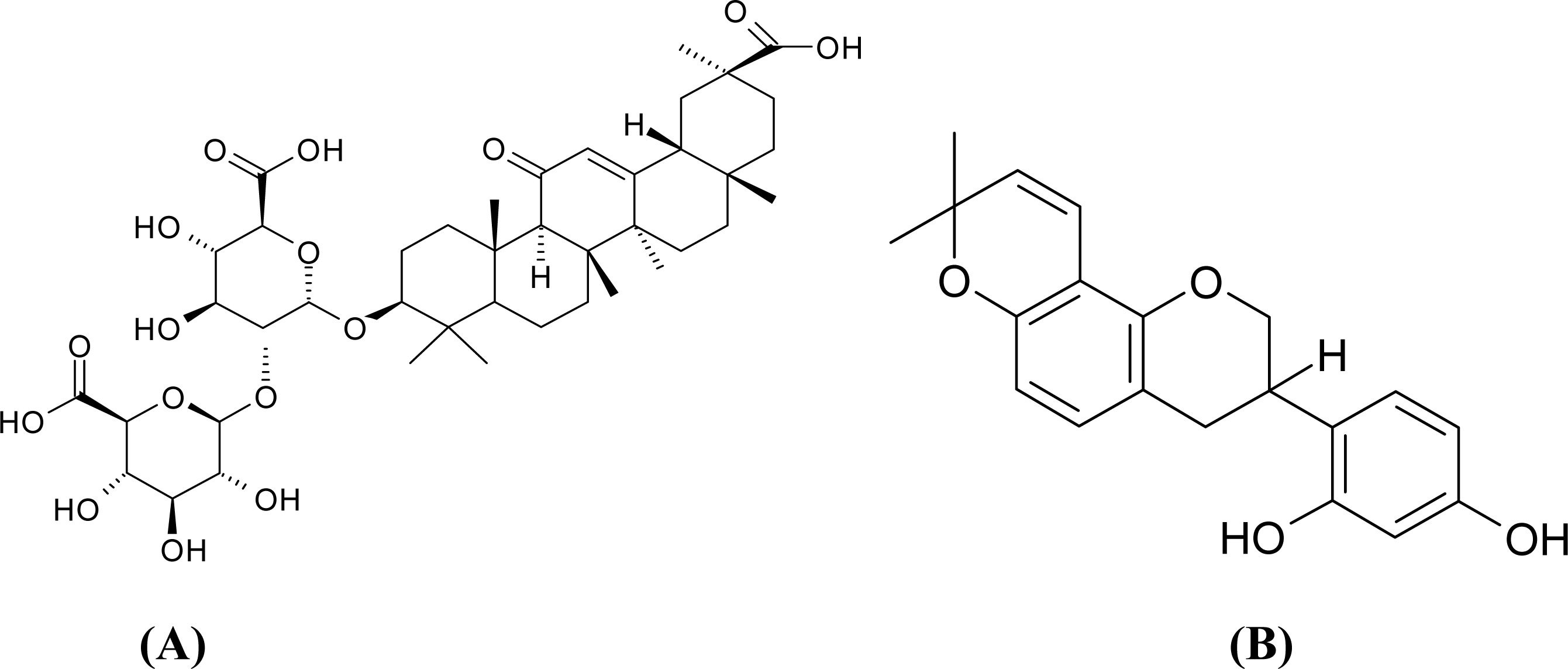 Molecular structures of glycyrrhizic acid (A) and glabridin (B).