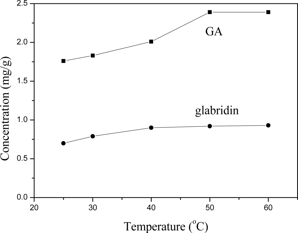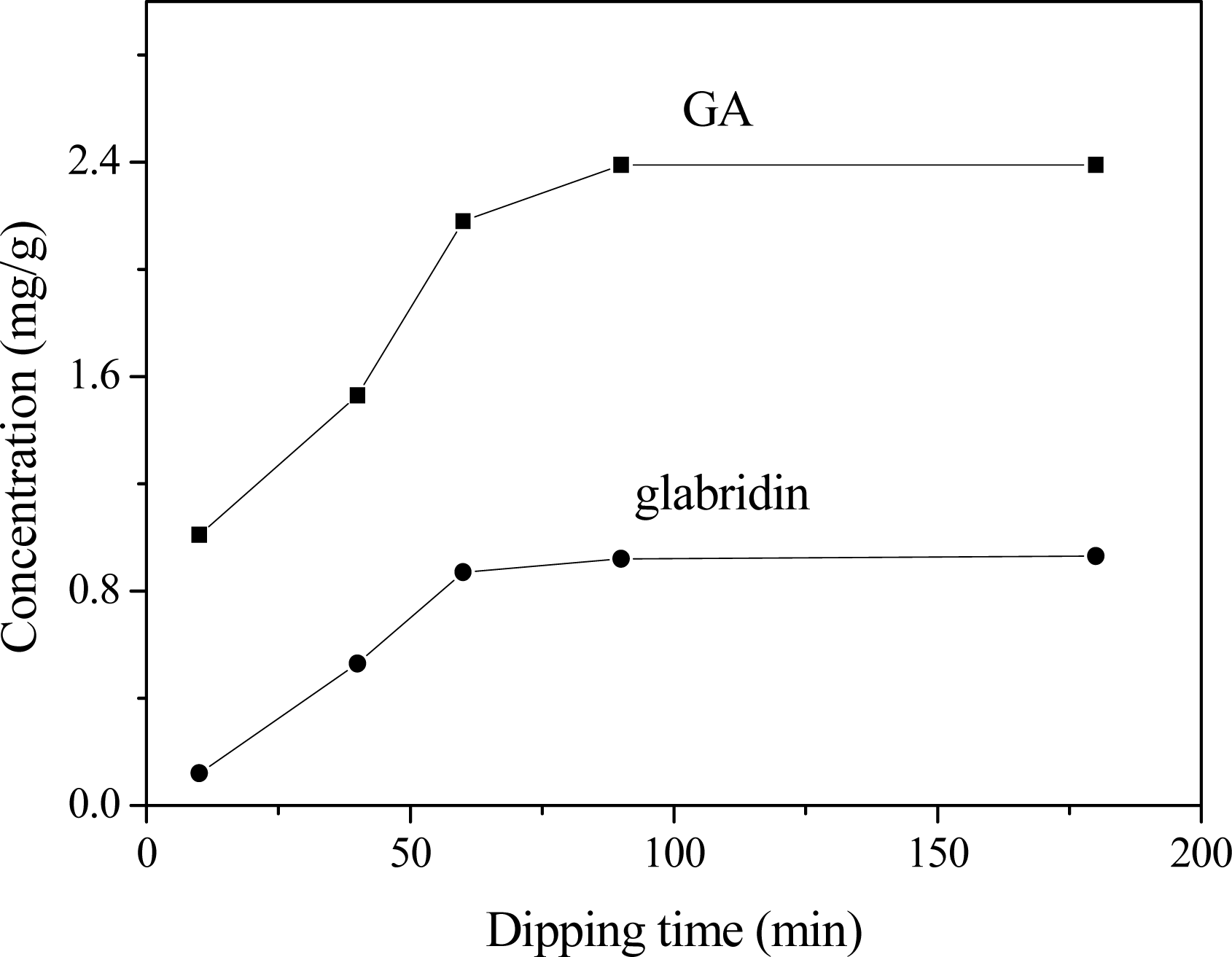 Different dipping temperatures ranged from 25°C to 60°C were evaluated, the dipping time was 60 min and the results were shown in Figure 4. The extracted amounts of GA and glabridin increased quickly with the temperature increasing from 20°C to 50°C and almost constant when temperature higher than 50°C. Compared the results with dipping method, the extracted amounts of GA and glabridin from licorice by 90 min dipping under room temperature were the almost same as 60 min dipping under 50°C. The results indicated shorter dipping time with higher temperature and 50°C was the optimized temperature for licorice extraction in this work.