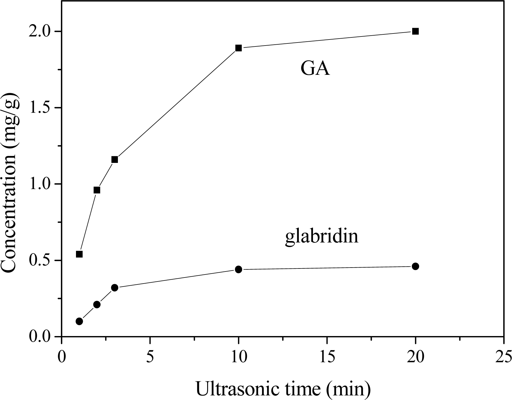 The different extraction methods such as dipping extraction and ultrasonic extraction were investigated by 1.0 g licorice powder extracted with 50 mL ethanol/water (30:70, v/v). In dipping extraction, the powder of licorice was mixed and stirred with solvent for different times. In Figure 2, the extracted amounts of GA and glabridin increased as the dipping times was increased from 10 min to 90 min and no obvious increased after further prolong extraction time. Equivalent samples were then prepared by an ultrasonic method without dipping time. Figure 3 shows that the extracted amounts of GA and glabridin increased with an increase of ultrasonic time. However, comparing the results of the two methods, it was found that the amounts extracted via the ultrasonic method were lower, while more energy was required in the experiments. Thus, it was determined that the ultrasonic method was not appropriate for this approach.