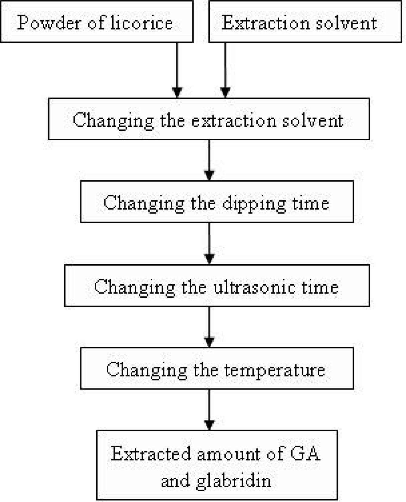 The licorice roots were oven-dried, sliced and crushed into powder for the extraction experiments. Extraction procedures of GA and glabridin are shown in Figure 5. The stocked standards of GA and glabridin were dissolved in methanol and further diluted to different working standard solution.