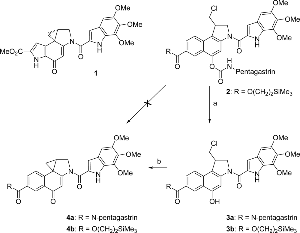 (+)-Duocarmycin SA (1), prodrug 2, seco-drugs 3 and drugs 4; a) enzymatic toxification of the novel carbamate prodrug 2 to the seco-drug 3b inside the tumor cells and b) rapid cyclisation of the seco-drugs 3 in situ to give the cytotoxic drugs 4.