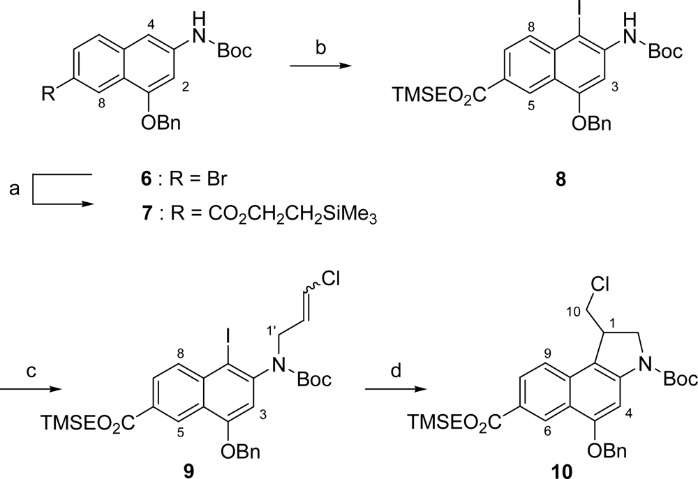 As starting material for the preparation of 2 we employed the known aminonaphthalin 6 [12]. 6 was converted into TMSE ester 7 in 56 % yield by a palladium-catalyzed carbonylation reaction using a CO atmosphere (1 bar) and Mo(CO)6 as additional CO source [19] in a mixture of 2-(trimethylsilyl)-ethanol and DMF (Scheme 2). The moderate yield of 56% of this carbonylation reaction might be due to the relatively high electron density of 6. Nevertheless, 6 had to be used in the carbonylation reaction as the Curtius rearrangement of the corresponding acid to the protected naphtholamine could not be achieved after the introduction of the TMSE ester moiety. Iodination of 7 employing NIS [20,21] with TsOH·H2O as catalyst followed by N-alkylation of the formed 8 with 1,3-dichloropropene and subsequent radical cyclization [22] using the untoxic tris-(trimethylsilyl)-silan (TTMSS) [23] as hydride source and AIBN as radical starter provided seco-CBI derivative 10 in 65 % yield over three steps.
