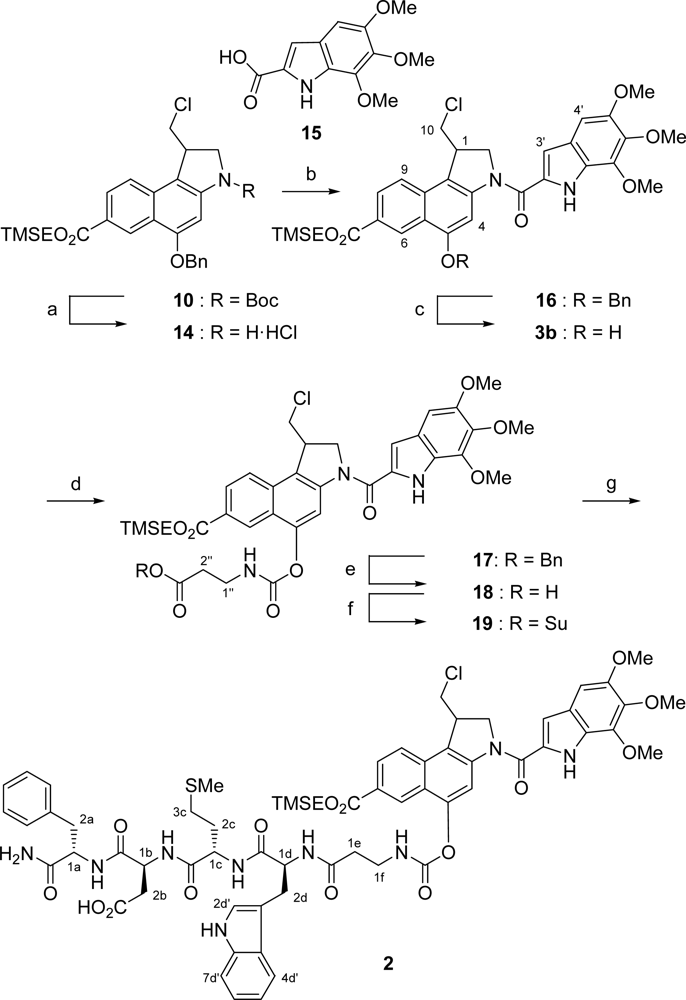(1R/S)-1-Chloromethyl-5-(l-phenylalaninamidyl-l-aspartyl-l-methionyl-l-tryptophyl-β-alanyl-carbonyloxy)-3-(5,6,7-trimethoxyindole-2-carbonyl)-2,3-dihydro-1H-benz[e]indole-7-carboxylic acid [2-(trimethylsilyl)-ethyl] ester (2): A magnetically stirred solution of tetragastrin (20)[27] (39.4 mg, 66.0 μmol) in water (1 ml) was treated with NEtiPr2 (11.5 μl, 8.50 mg, 66.0 μmol) and dropwise with a solution of crude 19 (49 mg, 60 μmol) in DMF (3.5 ml). Stirring was continued for 7 h at 20 °C. The ensuing mixture was adjusted to pH 2 with HCl (2 n) and extracted with EtOAc (5 × 5 ml). The combined organic phases were washed with water (5 ml) and brine (5 ml), treated with toluene (5 ml) and concentrated under reduced pressure. The resulting yellow solid was adsorbed on silica gel and subjected to column chromatography (CH2Cl2/MeOH = 15:1 + 0.5 % HOAc → 10:1 + 0.5 % HOAc) to give 2 (45 mg, 57 % over two steps, 83 % based on recovery, 1:1 mixture of both diastereomeres) as light yellow solid. Further purification was achieved by HPLC. Rf = 0.27 (CH2Cl2/MeOH = 10:1 + 0.5 % HOAc); 1H NMR (600 MHz, [D7]DMF): δ = 0.10/0.12 (2 × s, 9 H, Si(CH3)3), 1.20 (mc, 2 H, CH2SiMe3), 1.98–2.07 (m, 5 H, 2c-H2, SCH3), 2.37–2.66 (m, 6 H, 2b-H2, 3c-H2, 1e-H2), 2.98–3.06 (m, 3 H, 2a-Hb, 1f-H2), 3.17 (dd, J = 14.8, 8.4 Hz, 1 H, 2d-Hb), 3.21–3.24 (m, 1 H, 2a-Ha), 3.28–3.33 (m, 1 H, 2d-Ha), 3.88 (s, 3 H, OCH3), 3.90 (s, 3 H, OCH3), 3.95 (dd, J = 11.1, 7.9 Hz, 1 H, 10-Hb), 4.03 (s, 3 H, OCH3), 4.12 (dd, J = 11.1, 3.3 Hz, 1 H, 10-Ha), 4.30 (mc, 1 H, 1-H), 4.42–4.47 (m, 1 H, 1c-H), 4.50 (mc, 2 H, CH2OC=O), 4.58 (mc, 1 H, 1a-H), 4.64 (mc, 1 H, 1b-H), 4.67 (dd, J = 10.7, 2.2 Hz, 1 H, 2-Hb), 4.73 (mc, 1 H, 1d-H), 4.85 (dd, J = 10.7, 9.1 Hz, 1 H, 2-Ha), 6.57 (s, 1 H, NH), 6.97 (mc, 1 H, 5d′-H), 7.05 (s, 1 H, 4′-H), 7.06 (mc, 1 H, 6d′-H), 7.17 (mc, 1 H, 1 × Ph-H), 7.19 (mc, 2 H, 3′-H, 2d′-H), 7.24–7.32 (m, 4 H, 4 × Ph-H), 7.37/7.39 (2 × d, J = 8.0 Hz, 1 H, 7d′-H), 7.57/7.63 (2 × d, J = 7.9 Hz, 1 H, 4d′-H), 7.73 (brs, 1 H, NH), 7.83 (brs, 1 H, NH), 8.02 (d, J = 8.8 Hz, 1 H, 9-H), 8.05 (dd, J = 8.8, 1.6 Hz, 1 H, 8-H), 8.11 (brs, 1 H, 4-H), 8.18–8.44 (m, 4 H, NH), 8.99 (d, J = 1.6 Hz, 1 H, 6-H), 10.82/10.87 (2 × s, 1 H, indole-NHTrp), 11.34 ppm (s, 1 H, indole-NHTMI); 13C NMR (150 MHz, [D7]DMF): δ = –1.46/–1.42 (Si(CH3)3), 15.01 (SCH3), 17.67/17.76 (CH2SiMe3), 28.12 (C-2d), 30.79 (C-3c), 31.88 (C-2c), 32.09 (C-1e), 35.02 (C-1f), 38.16 (C-2a), 39.40 (C-2b), 42.21 (C-1), 47.94 (C-10), 51.56 (C-1b), 53.65 (C-1c), 55.07 (C-1d), 55.27 (C-1a), 56.03 (C-2), 56.46/56.49, 61.36, 61.43 (3 × OCH3), 63.38 (CH2OC=O), 98.89 (C-4′), 101.95 (C-4), 107.19 (C-3′), 110.62 (C-3d′), 111.93 (C-7d′), 116.06, 124.35, 126.61, 131.78, 145.99 (C-3a, C-5a, C-7, C-9a, C-9b), 118.89 (C-5d′), 118.95 (C-4d′), 121.46/121.51 (C-6d′), 122.17, 129.86, 133.05, 139.97, 141.16 (C-2′, C-3a′, C-6′, C-7′, C-7a′), 123.75 (C-9), 124.41 (C-2d′), 126.85, 126.91 (C-6, C-8, Ph-Cp), 128.51 (C-3ad′), 128.78 (2 × Ph-C), 129.83 (2 × Ph-C), 137.33 (C-7ad′), 139.04 (Ph-Ci), 150.54 (C-5′), 152.52 (OC(O)N), 156.90 (C-5), 161.36 (C=OTMI), 162.20 (C=OAla), 166.96 (C(O)OTMSE), 170.71, 171.25, 172.27, 172.33 (4 × C=O), 184.62 ppm (C(O)OH); MS (ESI): m/z (%) = 633 (100) [M – C(O)NH-pentapeptide + H + Na]+, 573 (100) [M – C(O)NH-pentapeptide – Cl]–; HRMS: calcd for C64H74ClN9O15SSi: 1304.4556 [M + H]+; found: 1304.4558; HPLC (preparative): column: Kromasil 100 C18; eluent: 85 % MeOH, 15 % H2O + 0.05 % TFA; flow: 12 mL/min; Rt: 31–40 min.
