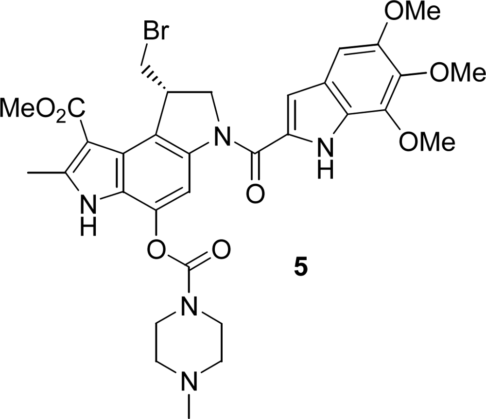 In our approach we did not employ the whole heptadecapeptide gastrin but the shorter β-alanine modified pentagastrin, because its β-Ala-Trp-Met-Asp-Phe-NH2 sequence representing the C-terminal amide of the natural peptides restores the biological activity of gastrin in a comparable order of magnitude [4e,16]. As a consequence, the seco-duocarmycin moiety 3b had to be attached via the N-terminal amino functionality of pentagastrin using a carbamate. Such a carbamate substructure exists also in KW-2189 (5) (Figure 1) [17], an agent already investigated in clinical trials, and in several other anticancer agents [18].
