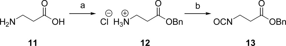 Synthesis of isocyanate 13. a) TMSCl, BnOH, 20 °C, 15 h, 89%; b) triphosgene, toluene, reflux, 7.5 h, 98%.