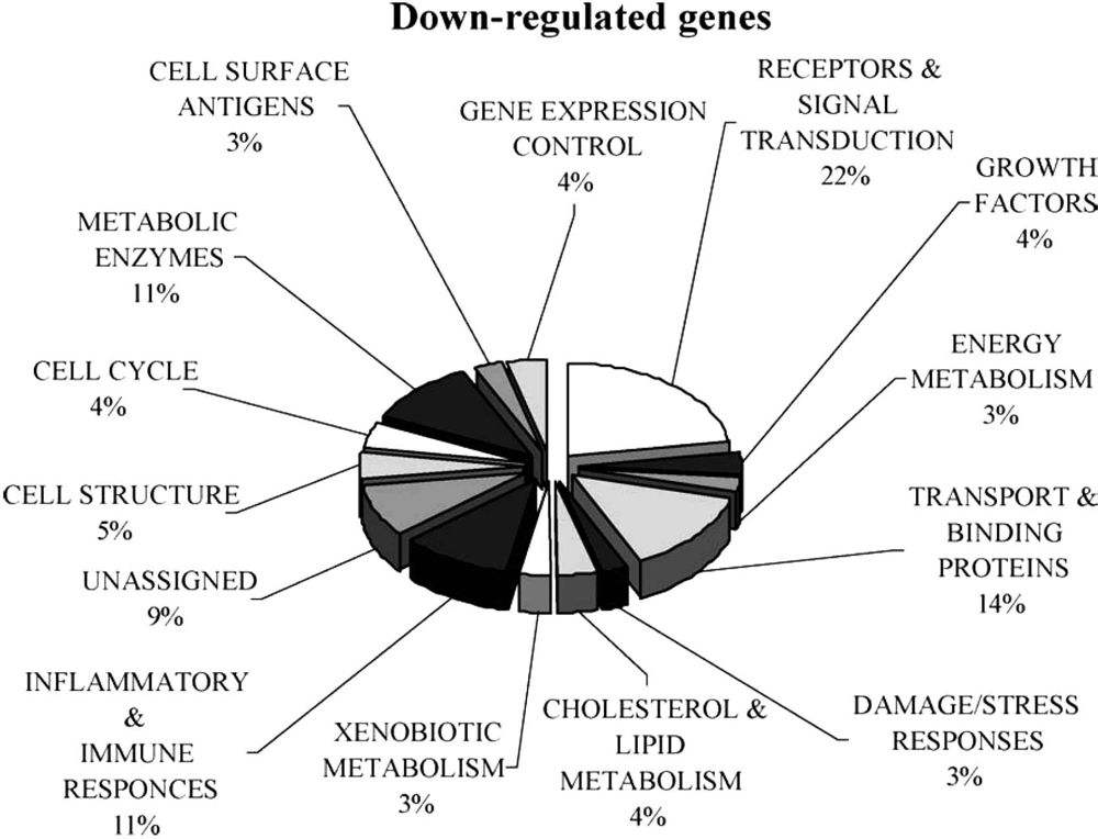 Diagram of the down-regulated genes after polyphenol-treatment and their function. The % indicated the % frequency of genes in a functional class relative to the total amount of genes varied by the treatment [].