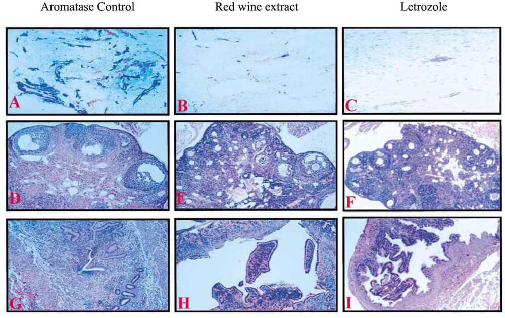 Red wine extract completely abrogated aromatase-induced hyperplasia and other changes in the mammary gland (B), ovary (E) and uterus (H), as compared to the control group (A, D and G), which showed comparable effects with Letrzole (C, F and I), a well known aromatase inhibitor. []