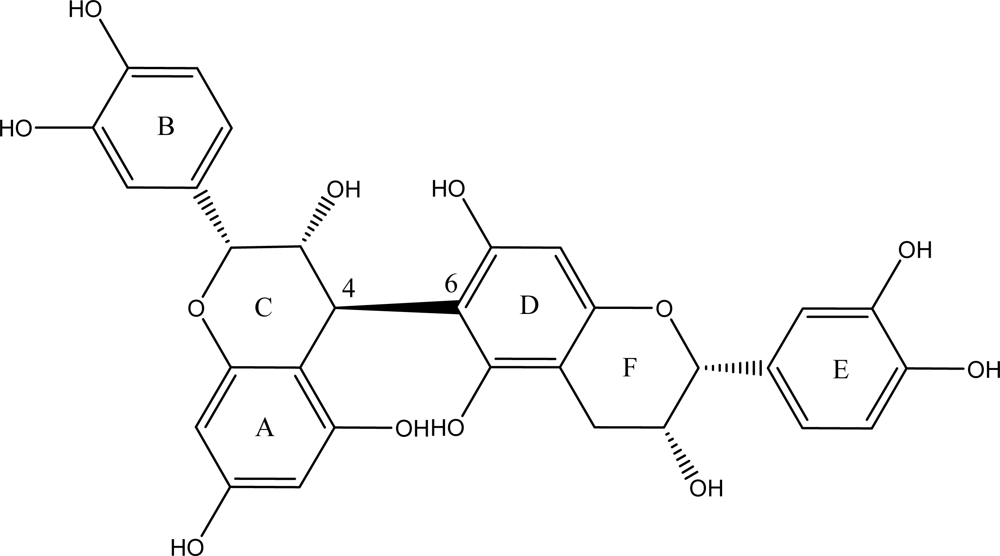 The chemical structure of procyanidin B5. Procyanidins B5–B8 are dimers with the 4–6 linkage and stereoisomers at position C-3.