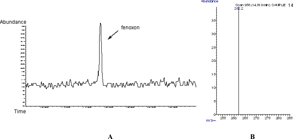 A) GC chromatogram of fenoxon (retention time 14.819 min). B) MS Characteristic ion of fenoxon (262.2 amu).