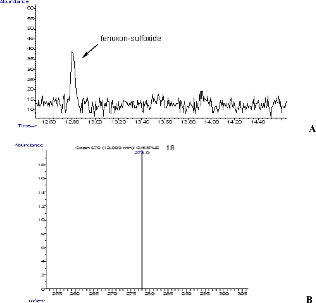 A) GC chromatogram of fenoxon-sulfoxide (retention time, 12.803 min). B) MS Characteristic ion of fenoxon-sulfoxide (278.0 amu).