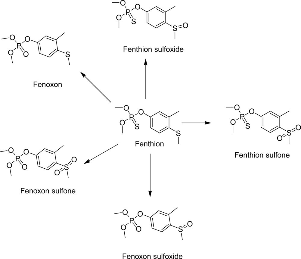 Organophosphorous insecticides such as dimethoate and fenthion constitute the most commonly applied means to protect olive fruits from Dacus oleae, which is the major pest of olive fruits in the Mediterranean region. In Greece, fenthion was used as the molecule of choice to control the action of Dacus oleae and was applied for almost 25 years in olive groves, before its banning on June of 2007. Thus, there is a considerable interest in fenthion and its metabolites residue (Scheme 1) assays in human samples [1].