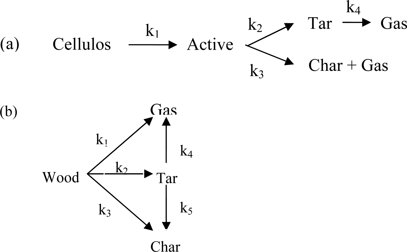 Figure 1. shows the two-stage semi-global reactions for cellulose and wood [