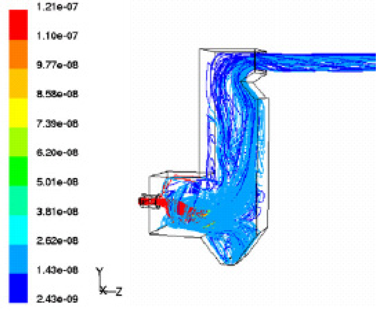 Figure 6). The improvements in boiler tube erosion performance can be deduced by visual assessment alone of the predicted flow and trajectory patterns.