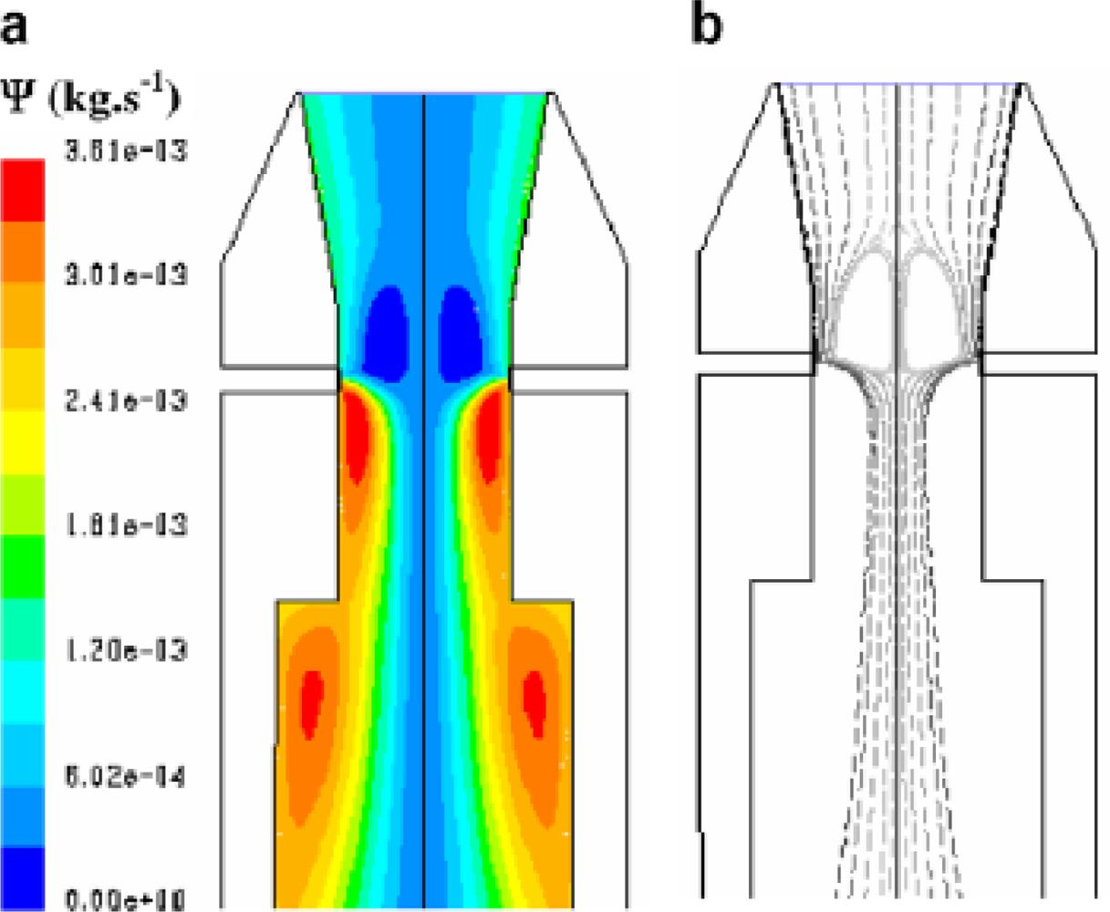 Figure 3 shows the temperature profile in the reactor. The heat of reaction is released mainly close to the injector. It induces a very hot zone in this area. The stream function is shown in