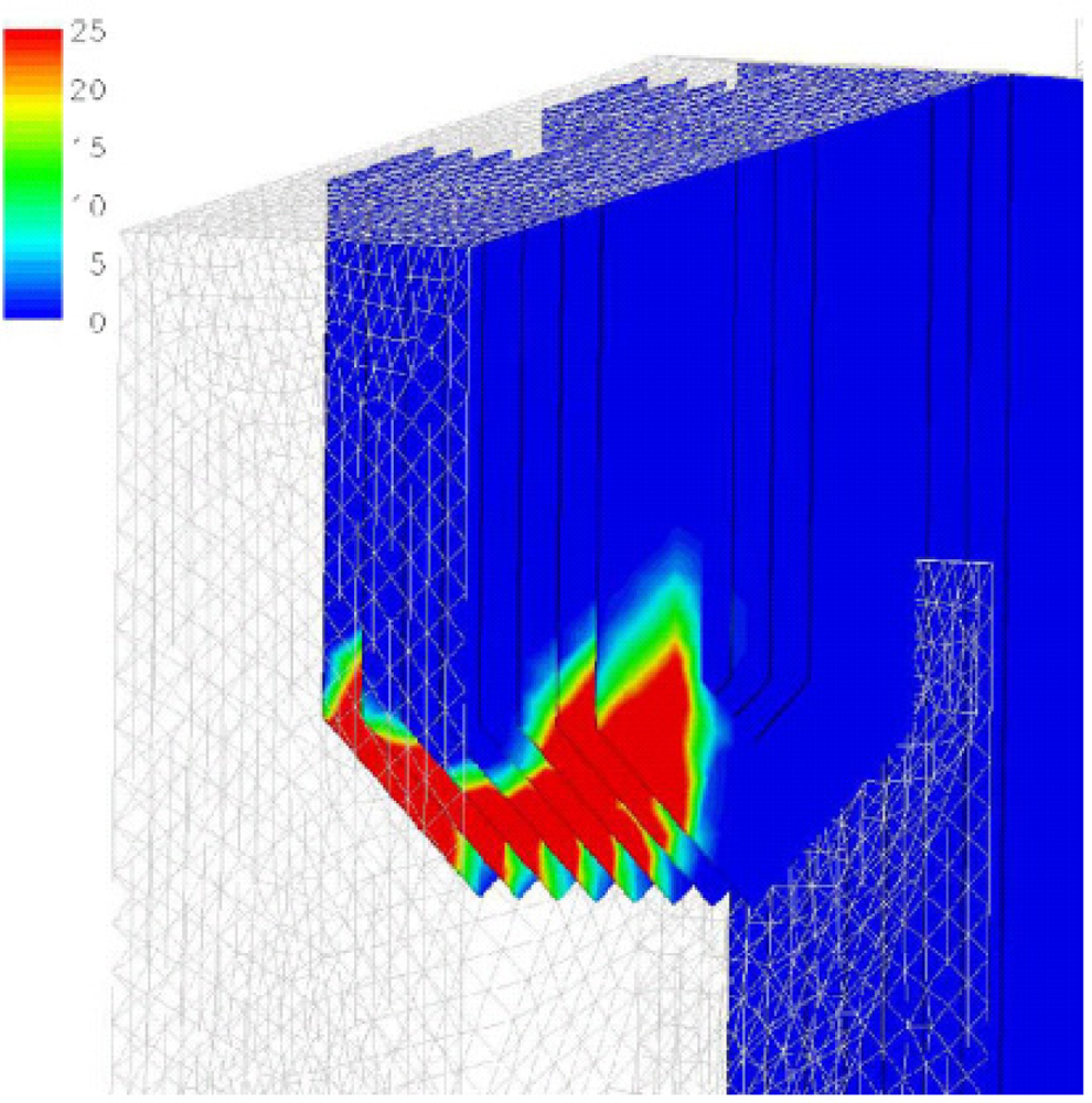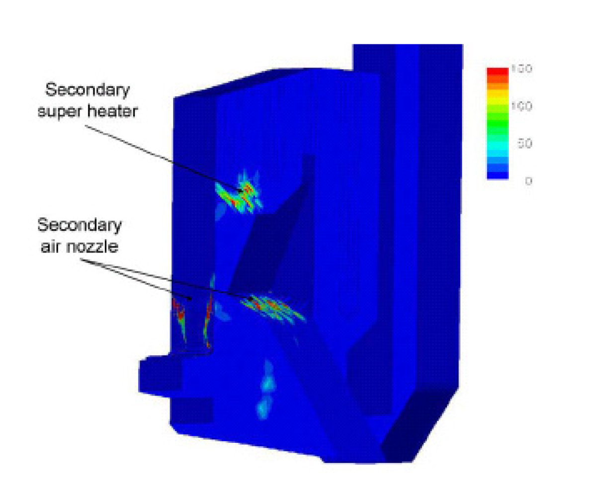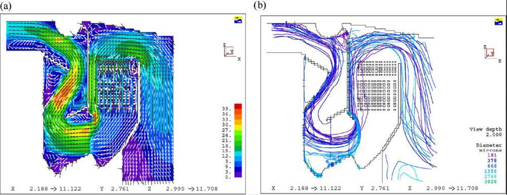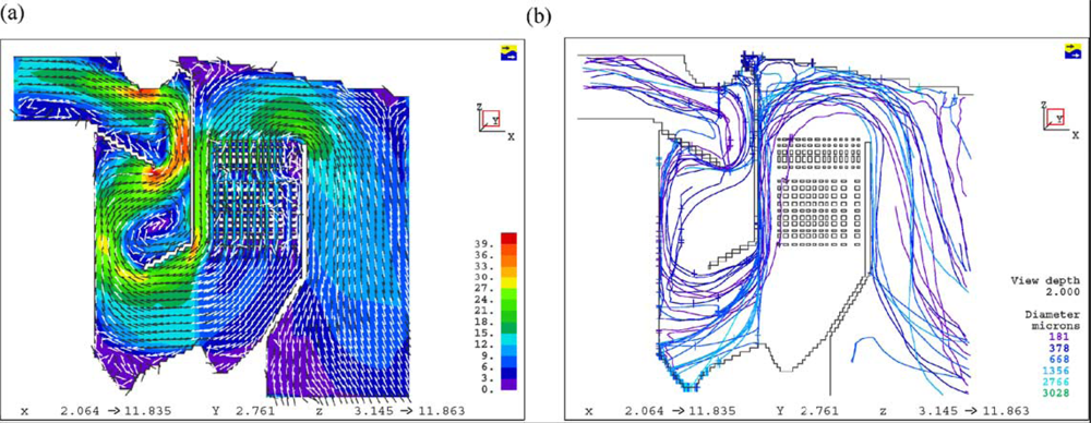 6 show a typical CFD erosion application in a tube bank for the boiler. Gas velocity contours (a) and trajectories for several particle fractions (b) are shown for the as-constructed design (