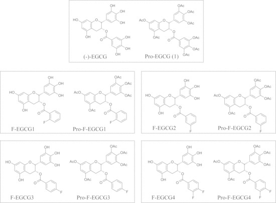 Chemical structures of EGCG and F-EGCGs as well as their pro-drugs.