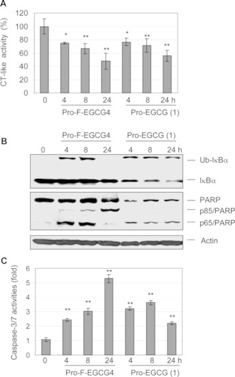 Treatment of Pro-EGCG (1) also caused a decrease in the level of the proteasomal CT-like activity in a time-dependent manner (Fig. 3A) and induced the increased level of the ubiquitinated form of IκB-α at all the time points (Fig. 3B). Treatment of Pro-EGCG (1) also resulted in caspase activation (increase of 2–3.5 folds) (Fig. 3C) and calpain activation, as shown by the appearance of p65 PARP fragment (Fig. 3B). We noticed that the slightly increased caspase activity was not associated production of p85 PARP (Fig. 3B), suggesting that activation of calpain is predominant (which cleaves PARP into p65 fragment, Fig. 3B) under the experimental conditions. However, under each condition, Pro-F-EGCG4 showed greater potency than Pro-EGCG (1) (Fig. 3).
