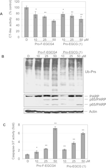 The proteasome-inhibitory and apoptosis-inducing effects of Pro-F-EGCG4 and Pro-EGCG (1) in dose-dependent manner. Jurkat T cells were treated with indicated concentrations of Pro-F-EGCG4 and Pro-EGCG (1) for 24 hours, DMSO (D) as solvent control, followed by preparation of cell extracts for measuring the chymotrypsin-like activity (A), Western blots analysis (B) and caspase-3/7 activities. * P < 0.05, ** P < 0.01, Bars, SD, mean of three experiments.