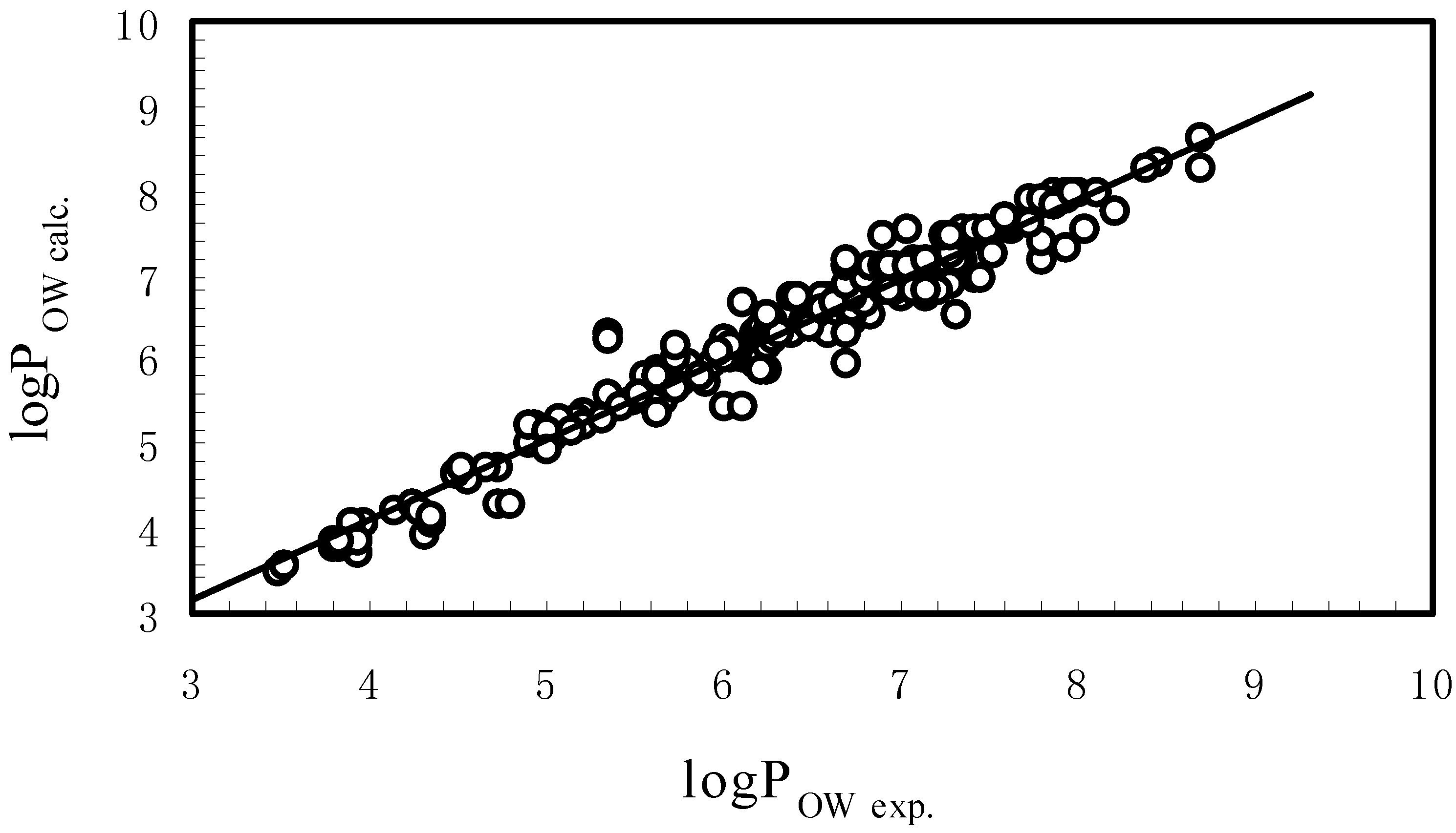 Figure 2 is the plot of experimental logPOW versus the calculated ones by Eq. (8), which shows that Eq. (8) has a good correlation and prediction ability. The standard deviation of the correlation equation is only 0.247 log units, which is within the experimental uncertainties. The result of Eq. (8) showed that the model (i.e., Eq. (2b)) can be employed to predict logW or logPOW for a wide range compounds with various structures.