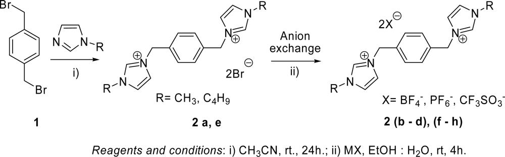 Compounds 2a/2e were prepared by stirring one equivalent of α,α′-dibromo-p-xylene and 2.1 equivalents of methyl/butyl imidazole in dry CH3CN for 24 hours at room temperature to give the respective quaternized salts. Solvent was removed under reduced pressure and the residue washed with acetone to remove the unreacted imidazole, followed by filtration to afford white precipitates of the dicationic imidazolium salts 2a/2e in quantitative yield. Compounds 2a/2e were dissolved with 4:1 (ethanol/water) along with a slight molar excess of NaBF4/KPF6/LiCF3SO3 and the mixture was stirred for 4 hours at room temperature to afford the respective anion exchanged products 2b-d, f-h. After completion of the reaction period, the mixture was concentrated under reduced pressure as much as possible, followed by addition of anhydrous MgSO4. The solid material was extracted using Soxhlet extraction with ethanol for 3 hours to afford the ionic liquids 2b-df-h, in 82–90 % yield.