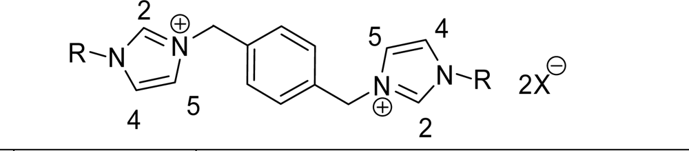 α,α′-Dibromo-p-xylene, 1-methyl imidazole, 1-butyl imidazole and solvents were purchased from commercial sources and used without further purification. 1H- and 13C-NMR were recorded on a Jeol 400 MHz NMR spectrometer operating at 400 and 100 MHz, respectively. Chemical shifts are reported relative to TMS as reference for proton and carbon. Elemental analyses were carried out on a ThermoFinnigan Eager 300 elemental analyzer.