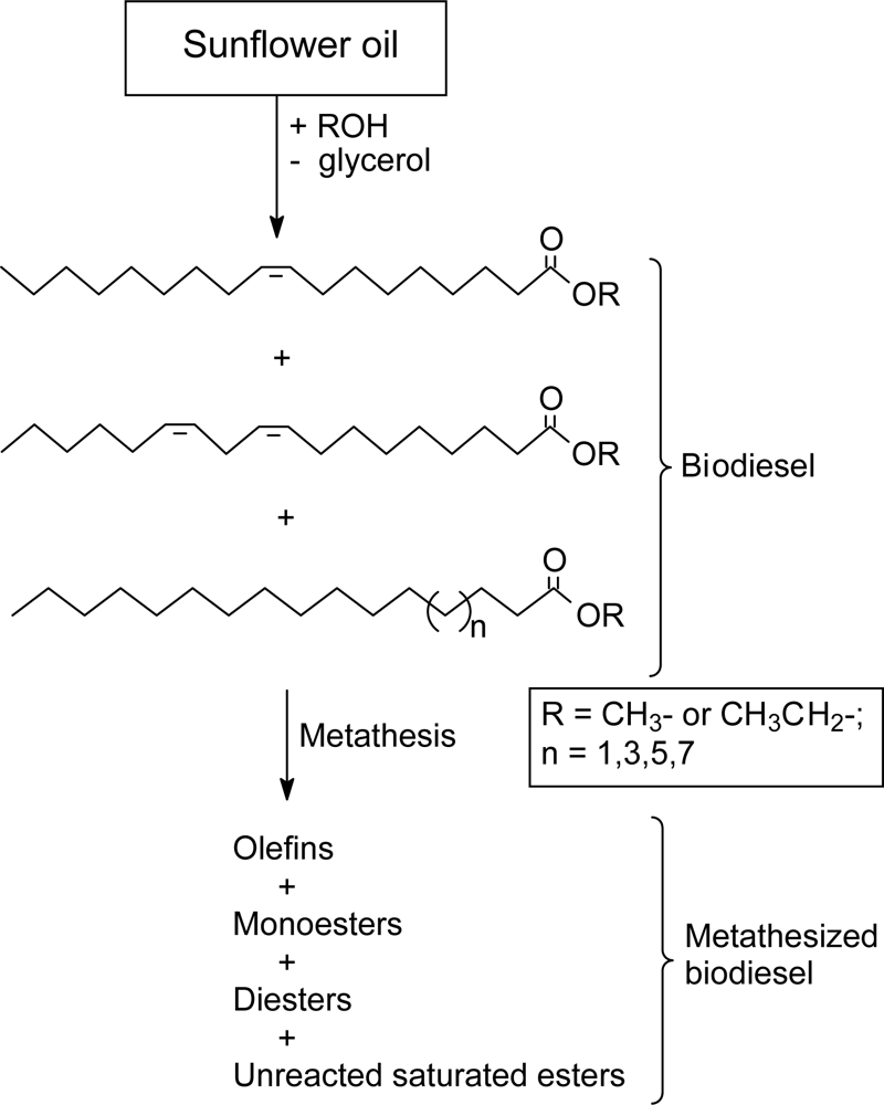 Although neat biodiesel (B100) could be used in most diesel engines directly, the fuel is more commonly blended with petroleum diesel in varying proportions, with the most common diesel mix being B2 (2% biodiesel) and B20 (20% biodisel) [32]. On the other hand, few chemical modifications could bring some improvements on its performance properties. One such modification involves the cross metathesis of the olefinic fatty acid esters (essentially oleic and linoleic acid esters) resulting in a mixture of olefins, monoesters and diesters as shown in Scheme 1. To achieve this kind of fuel reformulation a number of catalytic systems based on W, Re and Ru have proved effective (Table 2). These catalysts act selectively at the unsaturated sites of the olefinic fatty esters with minimal activity for the substituent groups. The saturated esters remain essentially unaffected due to the absence of carbon-carbon double bonds.