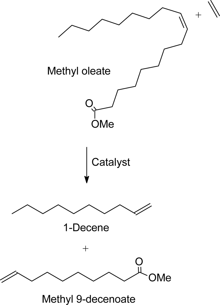Several catalysts based on W, Re and Ru have been successfully applied in processes leading to the production of α-olefins. However, the well-defined Ru-based catalysts are preferred due to their stability and exceptional tolerance for functional groups and oxygenates. The formulation of α-olefins from renewable resources via olefin metathesis offers an alternative and sustainable route to the currently used Fisher-Tropsch process which utilizes synthesis gas from coal or natural gas [62].