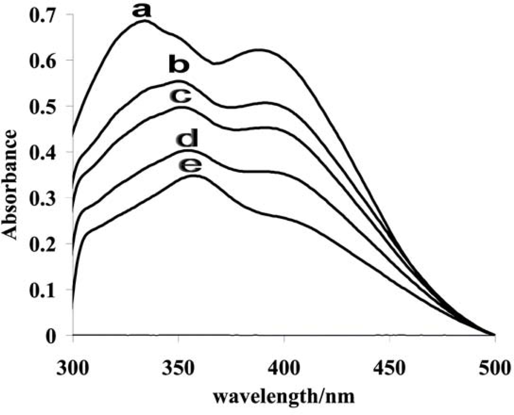 UV-Vis absorption spectra of 5 μM AMC in the absence of DNA (a), in the presence of 2.5 μM (b), 5 μM (c) 10 μ M (d) and 20 μM DNA (e) at pH 7.4 and 25 °C.
