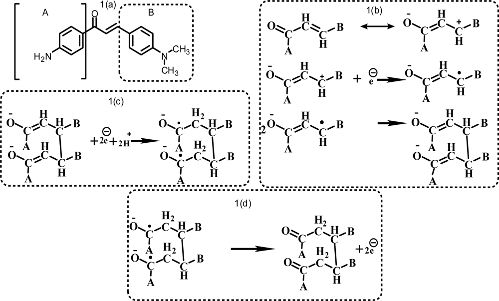 (a) Molecular structure of AMC [1-(4′-aminophenyl)-3-(4-N,N-dimethylphenyl)-2-propen-1-one]. (b) dimer formation AMC. (c) two electron/two proton reduction of the dimer of AMC (d) electrooxidation of the product.