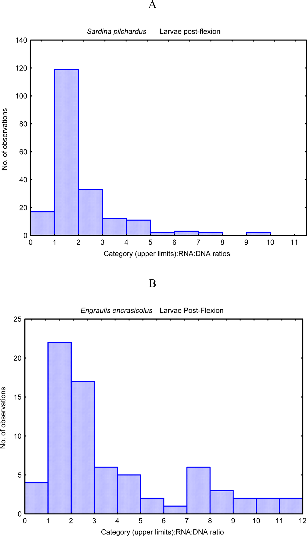 - Chícharo, MA; Chícharo, L; López-Jamar, E; Valdes, L; Ré, P. Estimation of starvation and diel variation of the RNA/DNA ratios of field caught Sardina pilchardus larvae off north of Spain. Mar. Ecol. Prog. Ser 1998, 164, 273–283. [Google Scholar]