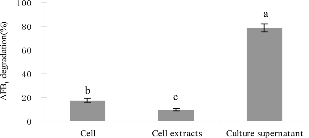 AFB1 degradation by cell, cell extracts and culture supernatant of S. maltophilia 35-3 after 72 h incubation. The values are means of three replicates and their standard errors. Means with different letters are significantly different according to Duncan’s Multiple Range Test (P <0.05).